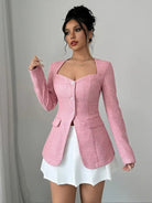 تُبرز هذه الجاكيت المزودة بالأزرار القوام بفضل قصتها الضيقة وفتحة عنقها المربعة الحديثة. مثالية لمظهر أنيق وأنثوي، يمكن ارتداؤها في المكتب أو للخروج. يضيف تصميمها الأنيق وأزرارها الرقيقة لمسة من الرقي الخالد إلى ملابسك.