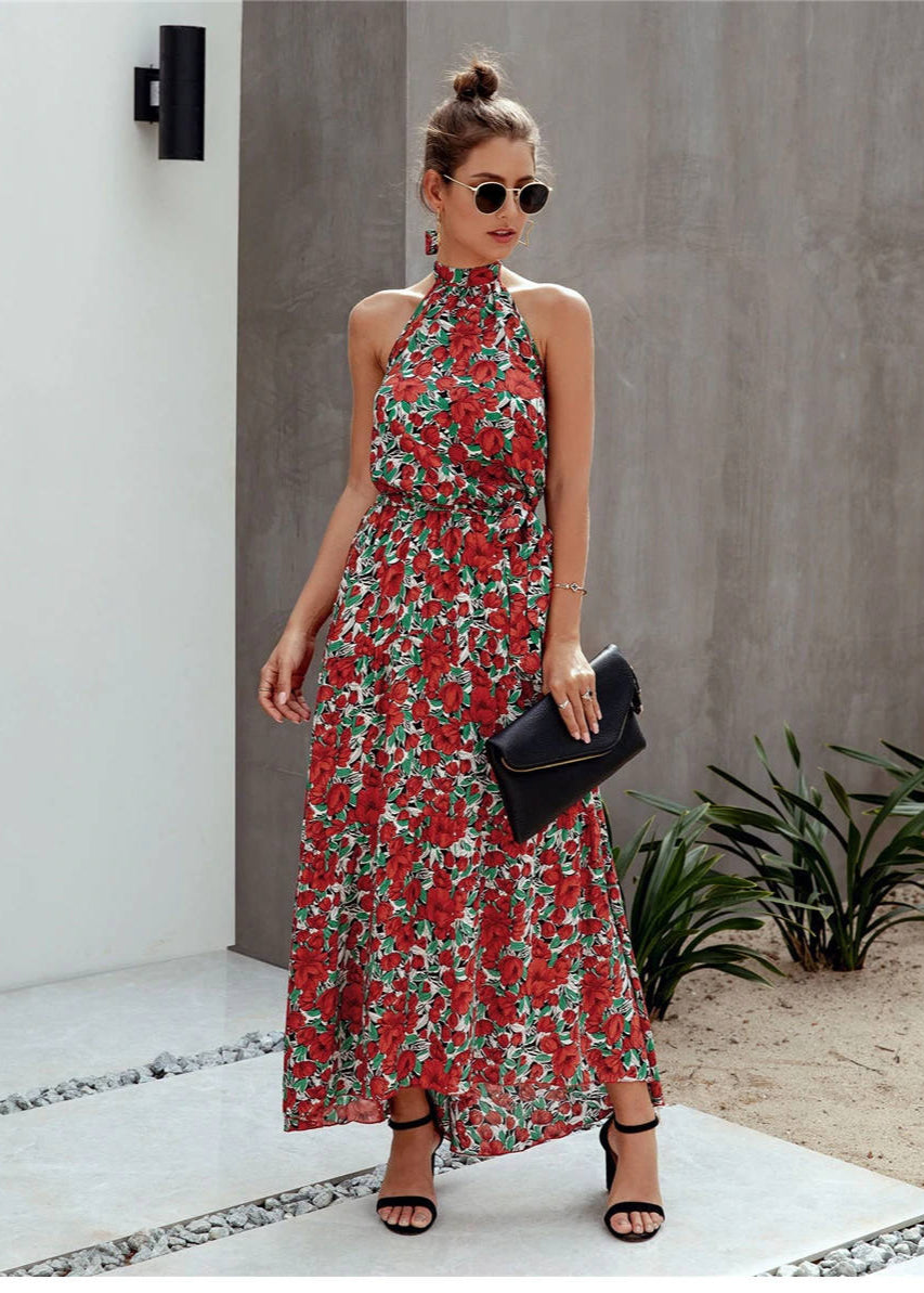 هذا الفستان الطويل بأسلوب بوهيمي أنيق يقدم أنماطًا زهرية وقصة انسيابية. يبرز ياقة العالية مع إغلاق خلفي الكتفين برقة.