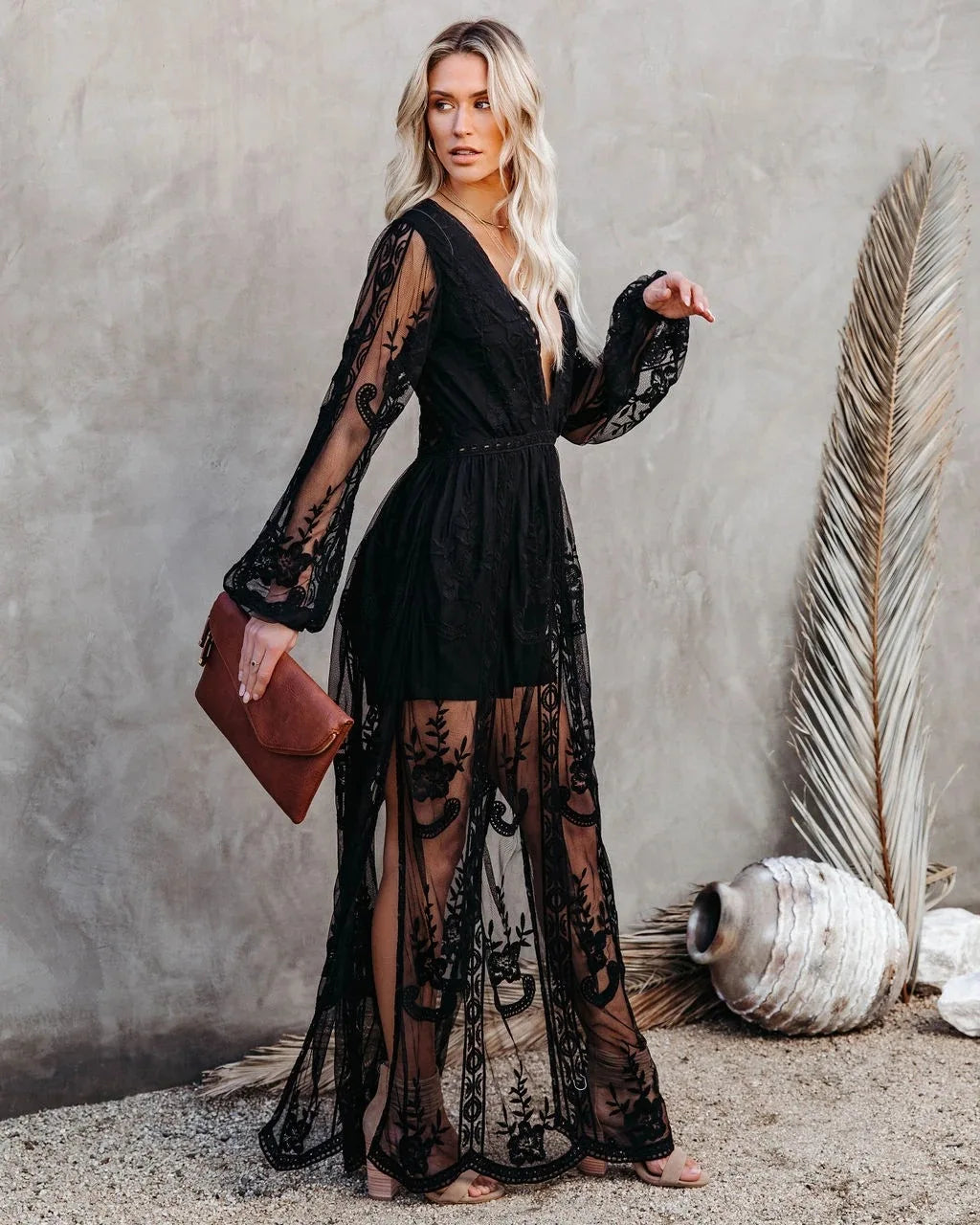 Αυτή η μακριά μαύρη φορεσιά με κεντήματα γοητεύει με τις λεπτομέρειες της και την V λαιμόκοψη που αναδεικνύει το πρόσωπο. Η ροή της γραμμής της επιμηκύνει τη σιλουέτα και τονίζει τη θηλυκότητα με σύγχρονο τρόπο. Ιδανική για καλοκαιρινές ημέρες και για κομψές βραδιές, συνδυάζει άνεση και εκλεπτυσμένη κομψότητα σε κάθε περίσταση.