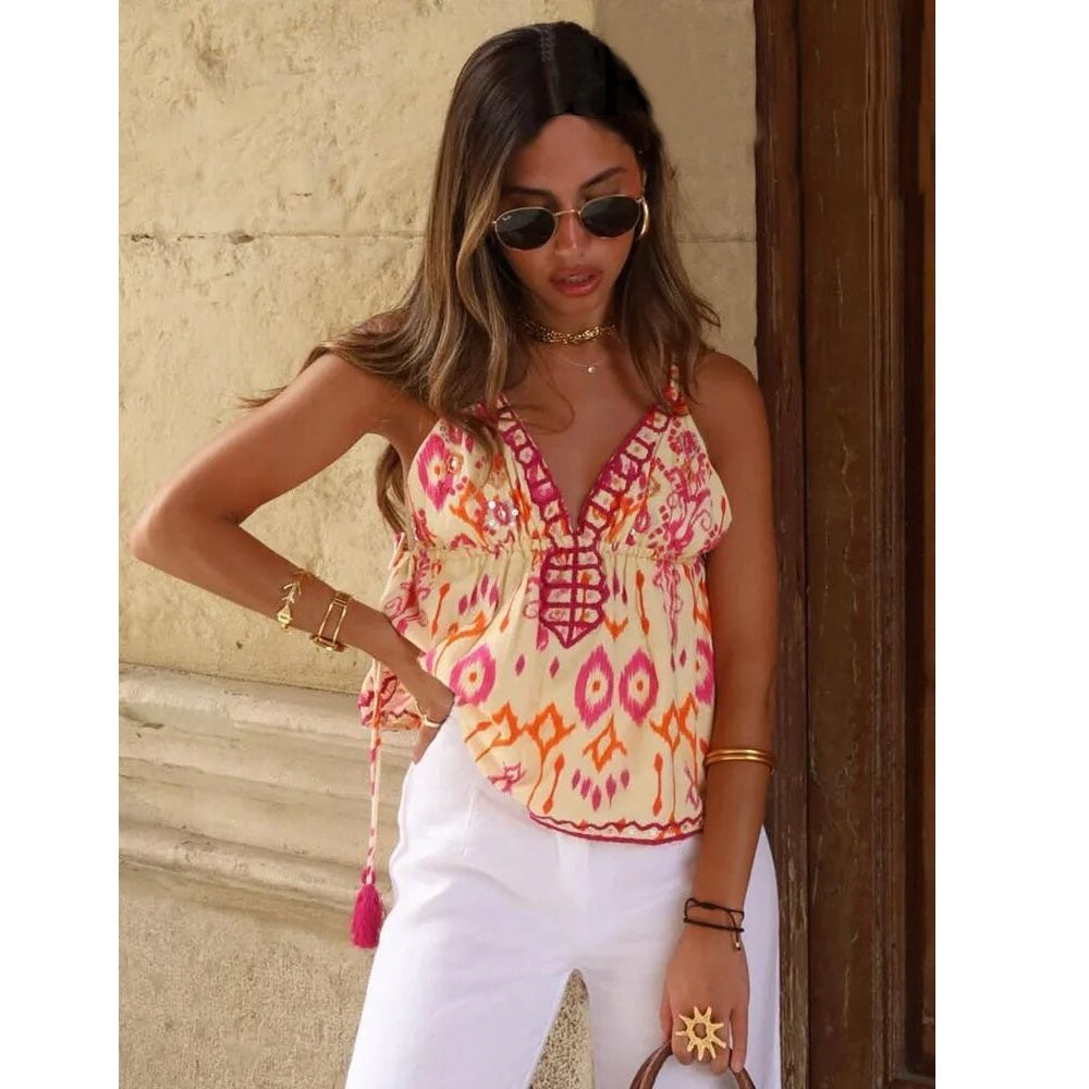 Αυτή η αμάνικη μπλούζα γοητεύει με το μοτίβο εμπνευσμένο από την αζτέκικη τέχνη και τα ζωντανά της χρώματα. Ελαφριά και ρέουσα, είναι ιδανική για ηλιόλουστες μέρες, συνδυάζοντας άνεση και χαλαρό στυλ.