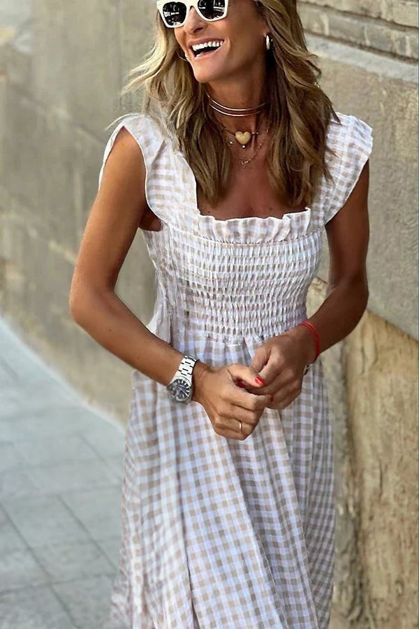 Με το διαχρονικό του καρό σχέδιο και τη σμιλευμένη μέση, αυτό το φόρεμα αναδεικνύει τη σιλουέτα με κομψότητα. Η ρέουσα γραμμή του εξασφαλίζει άνεση, ιδανικό τόσο για καθημερινές όσο και για πιο επίσημες περιστάσεις. Μια τέλεια ισορροπία μεταξύ στυλ και ελαφρότητας.