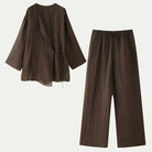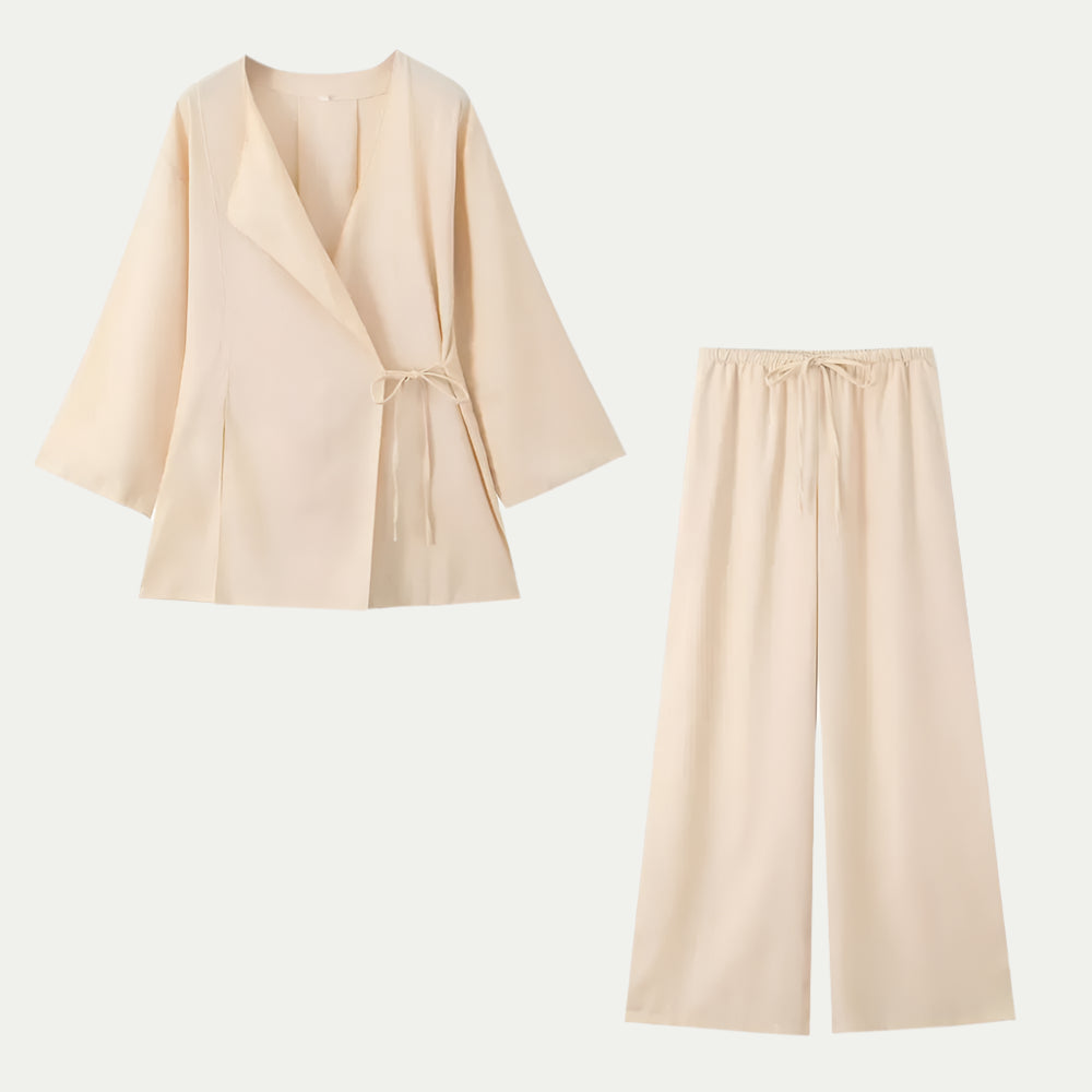 סט זה משלב חולצת קימונו עם שרוולים רחבים ומכנסיים בגובה מותן עם רגליים רחבות למראה זורם ומעודן. קל ונוח, הוא אידיאלי לימים חמים. זמין במגוון צבעים, הוא משלב סגנון קיץ עם חופש תנועה.