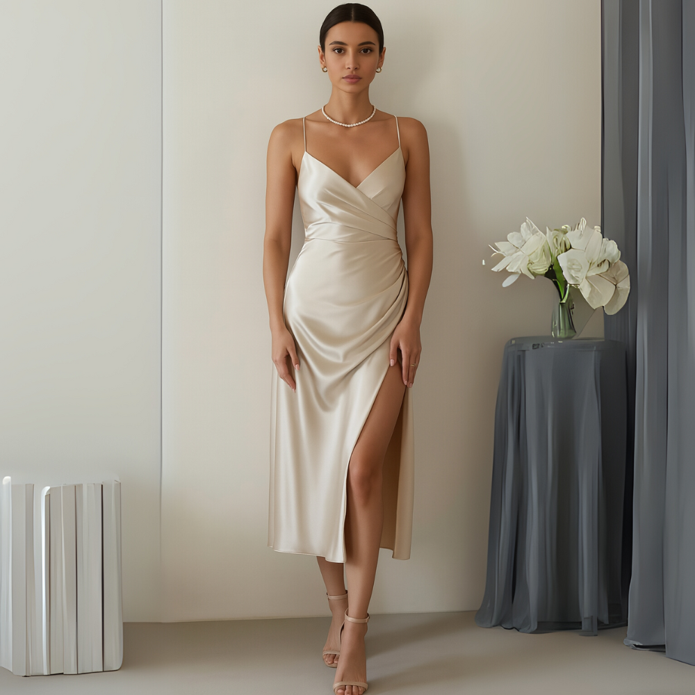 ג'ובנה | שמלת מידי מפוצלת – סגנון קל ורצועות עדינות