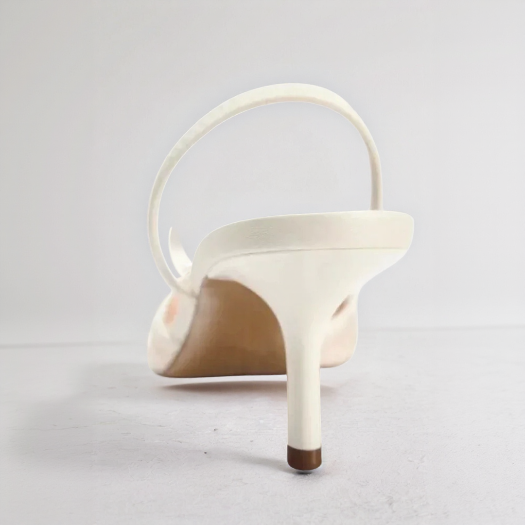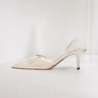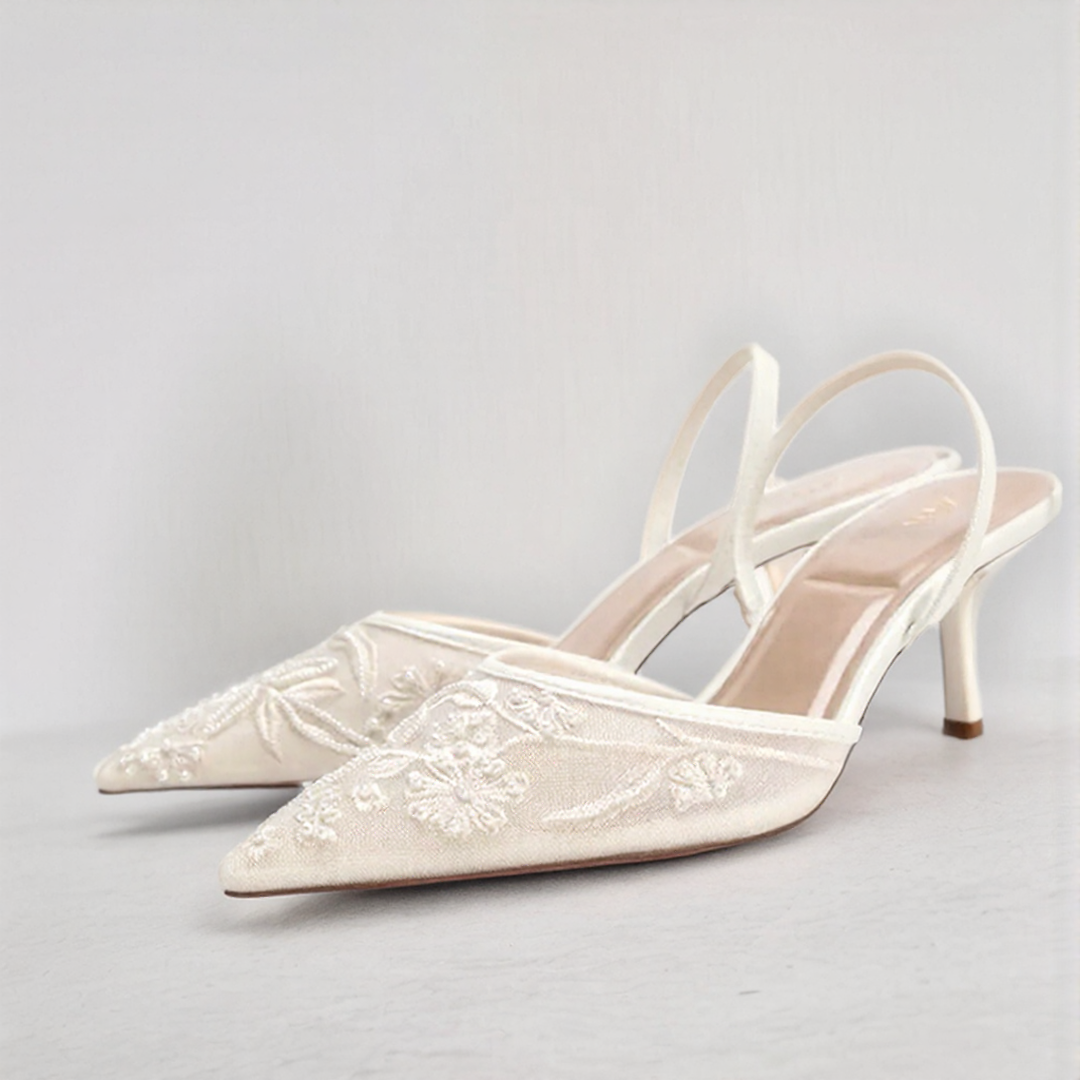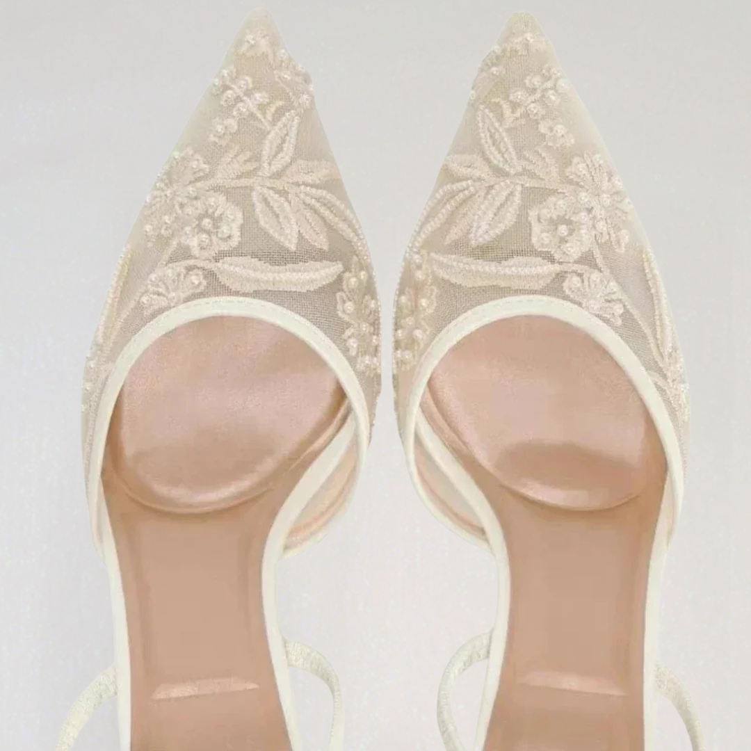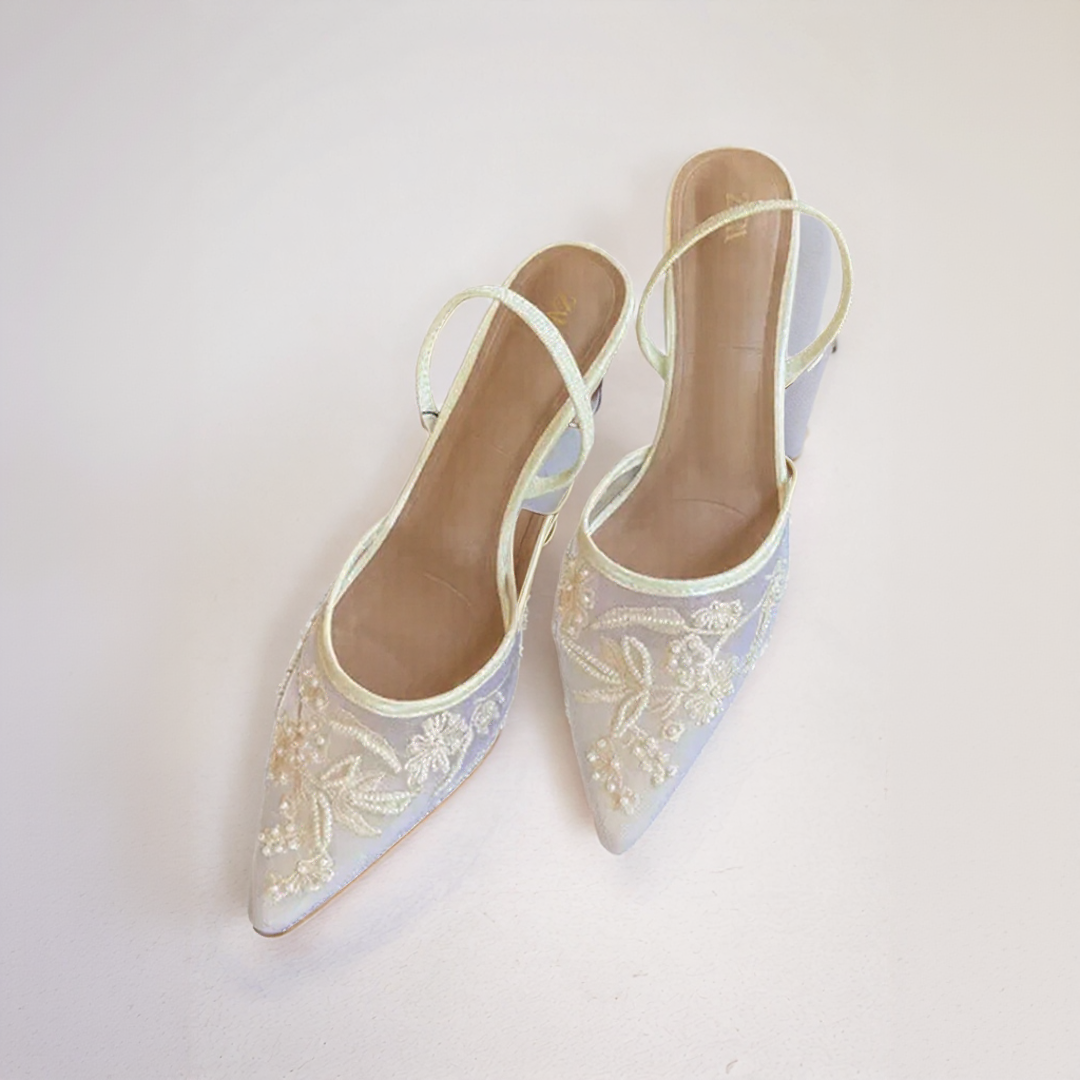 נעלי העקב הללו מתבלטות בזכות רקמת פרחים עדינה על חומרים קשים קלים ושקופים. הקצה המחודד שלהם מאריך את הסילואטה באלגנטיות, בעוד שהרצועה המתאימה מבטיחה אחיזה בטוחה תוך כדי הוספת נגיעה של עדינות.