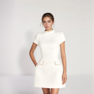 השמלה הקצרה הזו מציגה גזרה מחמיאה שמדגישה את הסילואט באלגנטיות. הכיסים המעוטרים שלה מוסיפים נופך של רף עדין, אידיאלי למראה שיקי ומודרני.