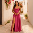 השמלה הארוכה ללא שרוולים מגלמת את הנשיות ברגישות. החיתוך שלה מדגיש את הכתפיים, בעוד שהחצאית הזורמת עם הפתיחה מלווה כל תנועה באלגנטיות. רכה למגע ונעימה ללבישה, היא מתאימה גם לערבים אלגנטיים וגם לרגעים יותר נינוחים.
