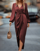 このミディ丈のロングスリーブクロスドレスは、その控えめなエレガンスとフラatteringなカットで魅了します。シックなデザインとフィット感のあるシルエットは、オフィスでも街の外出でも理想的なアイテムです。快適さと洗練の完璧なバランス。