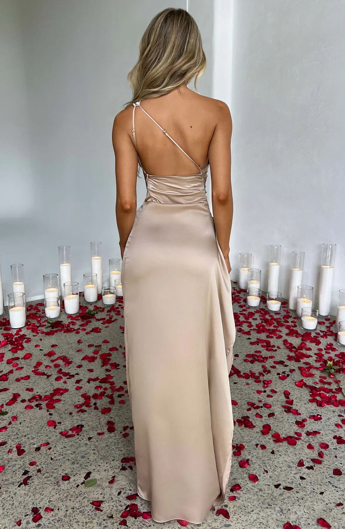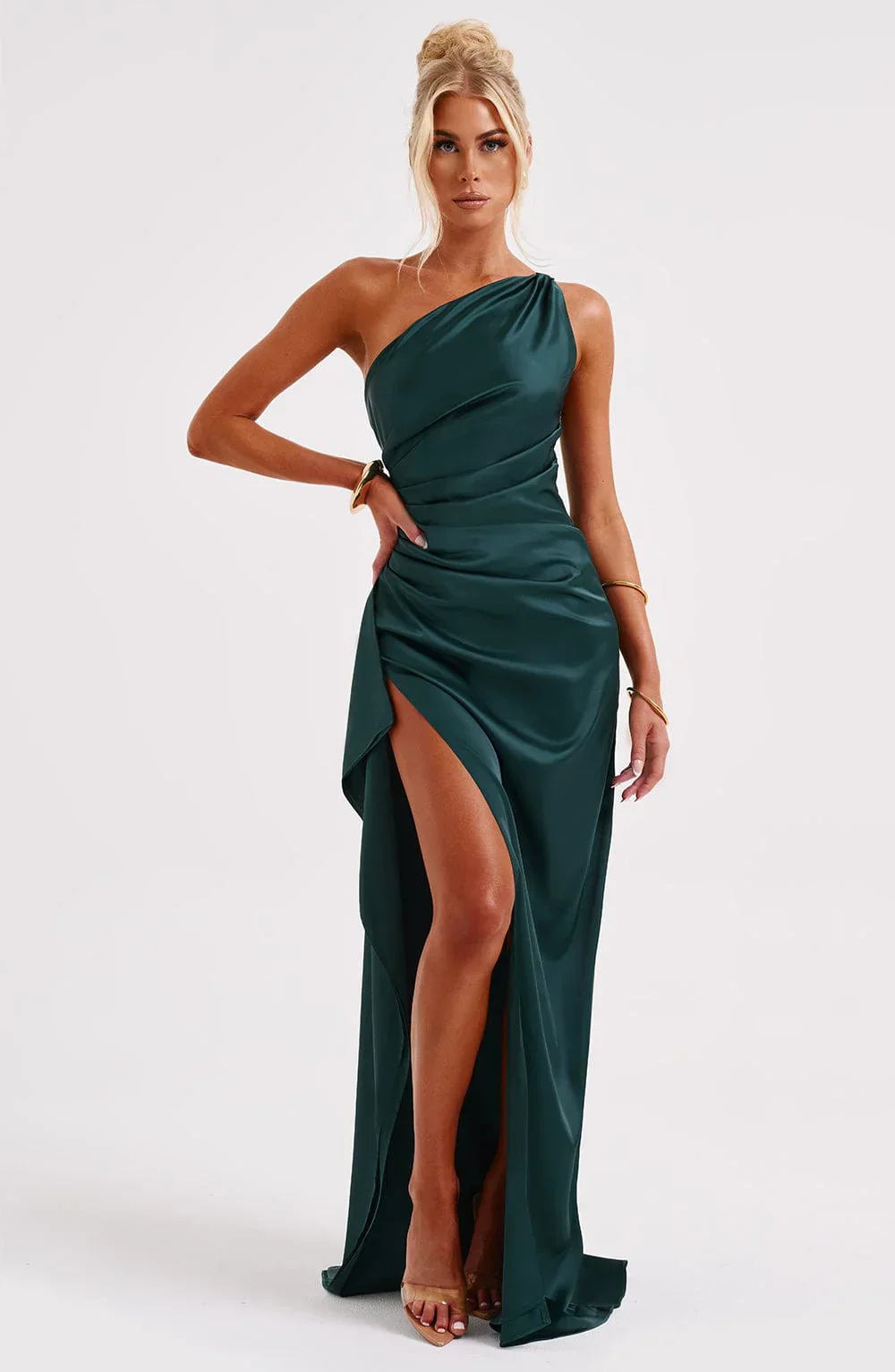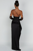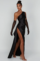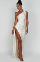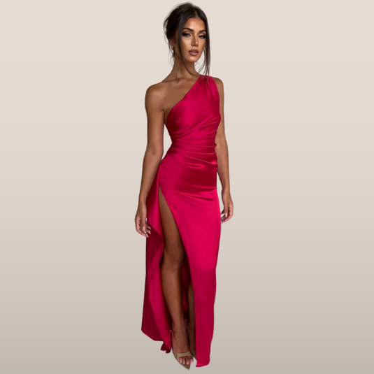 Este vestido longo com design assimétrico é realçado por uma fenda lateral. Seu corte elegante e confortável faz dele uma escolha ideal para noites e eventos formais.